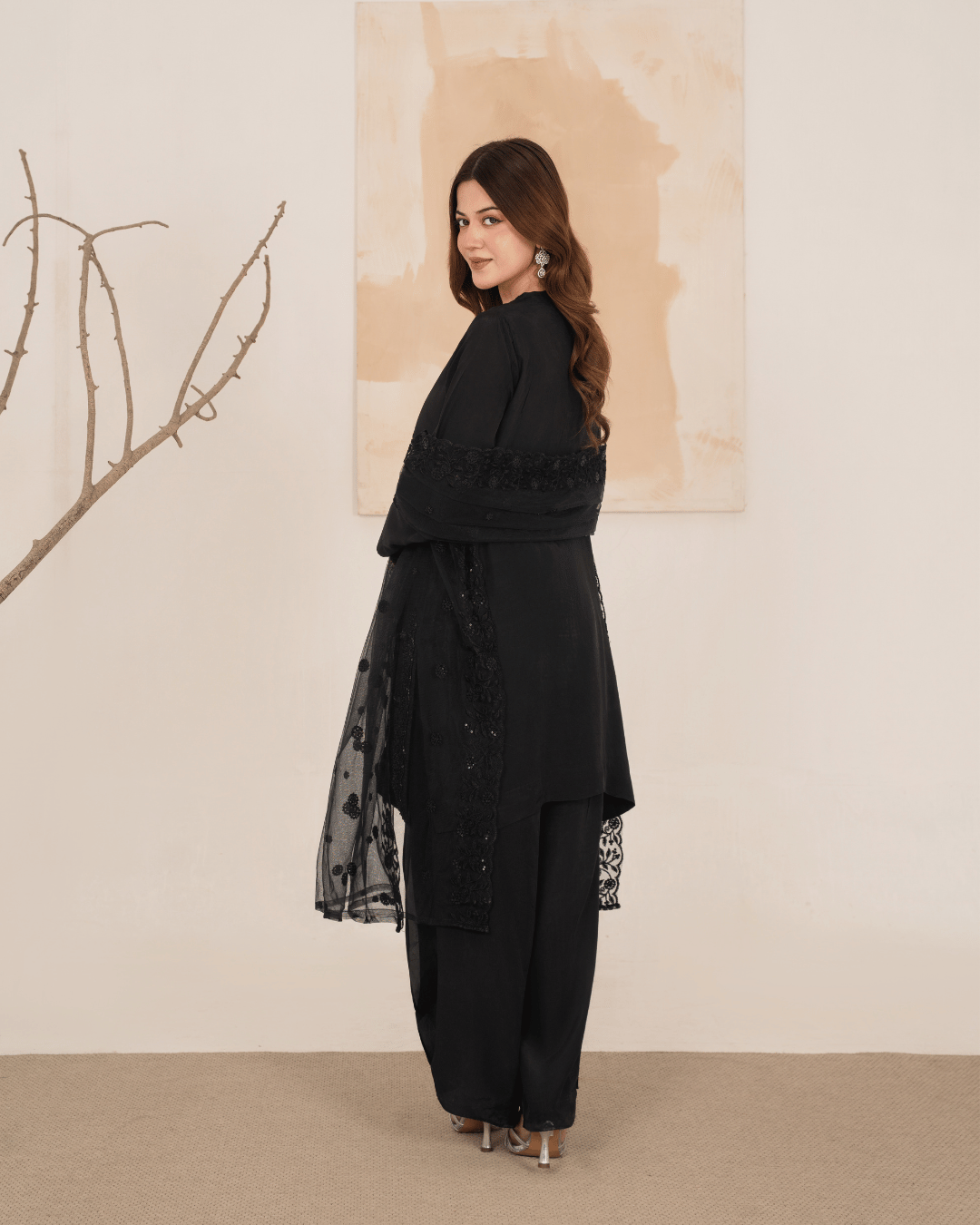 This exquisite Festive/Party Wear Kurta Set is a masterpiece in black Grip fabric. The short kurta features decorative stone work on the daman, adorned with cut dana and bead work. The flared bottoms are designed in a modest wrap style for a flowy silhouette. The net dupatta showcases intricate embroidery and sequin work, adding a touch of elegance. Elevate your style with Ray Online Store's sophisticated design.