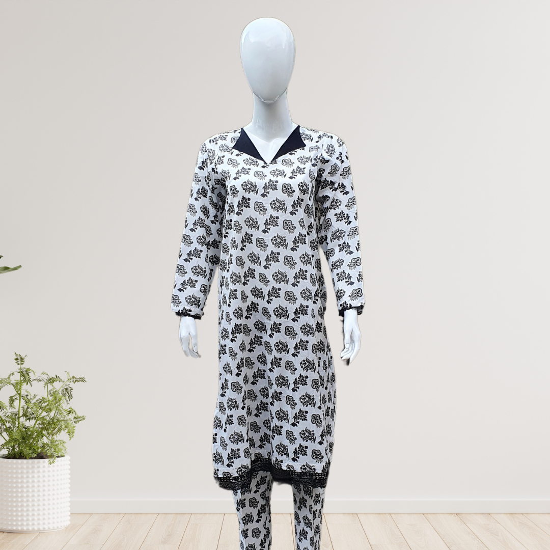Transform your summer wardrobe with our Chic Noir Blanc Attire-2 PC! Made with airy lawn fabric from Gul Ahmed, this co-ord set features a black chic collar and is perfect for hot summers. Stay comfortable and stylish all day long.