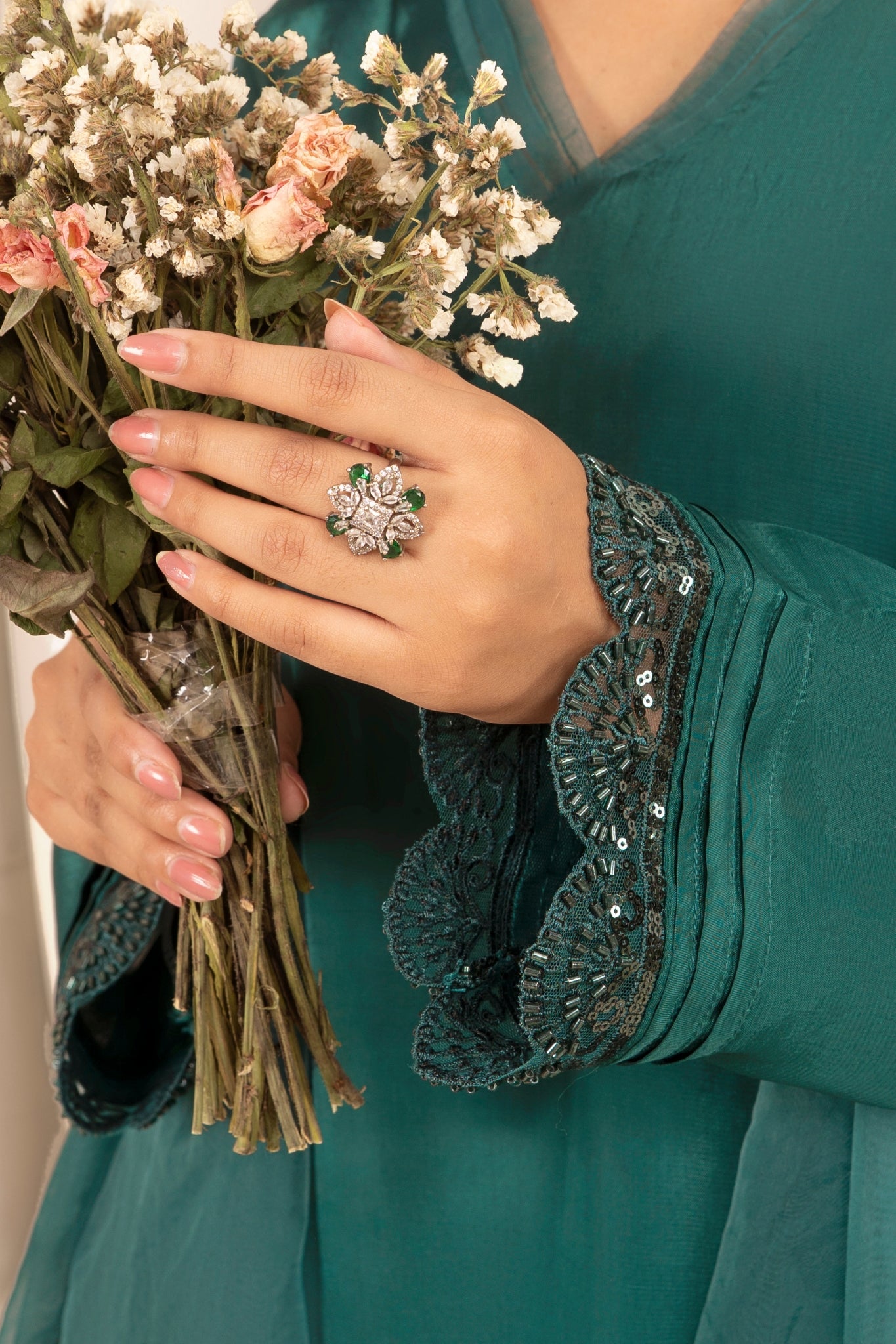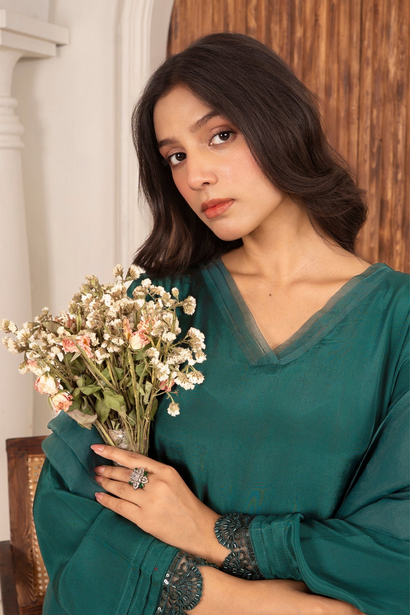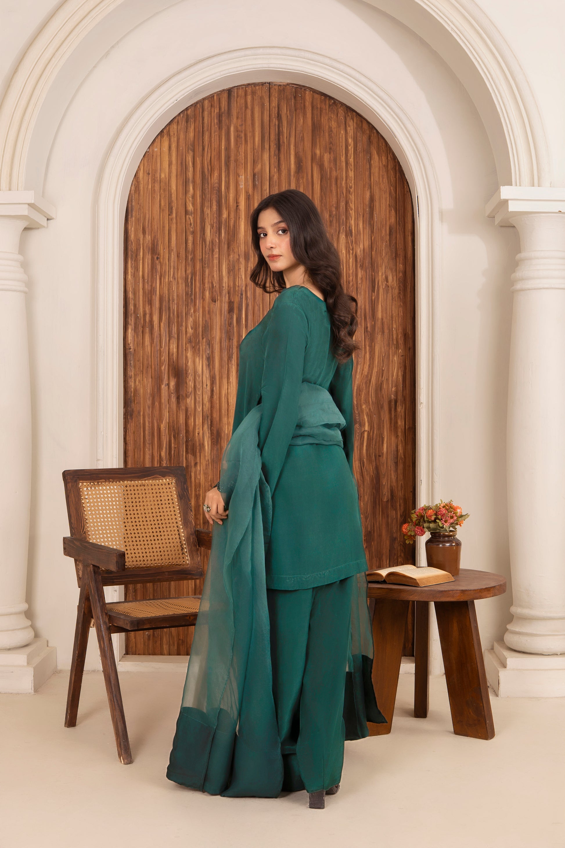 Get the perfect chic look in this solid emerald green farshi shalwar set.