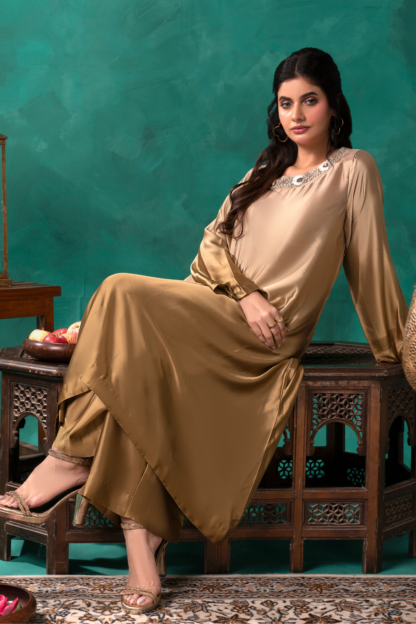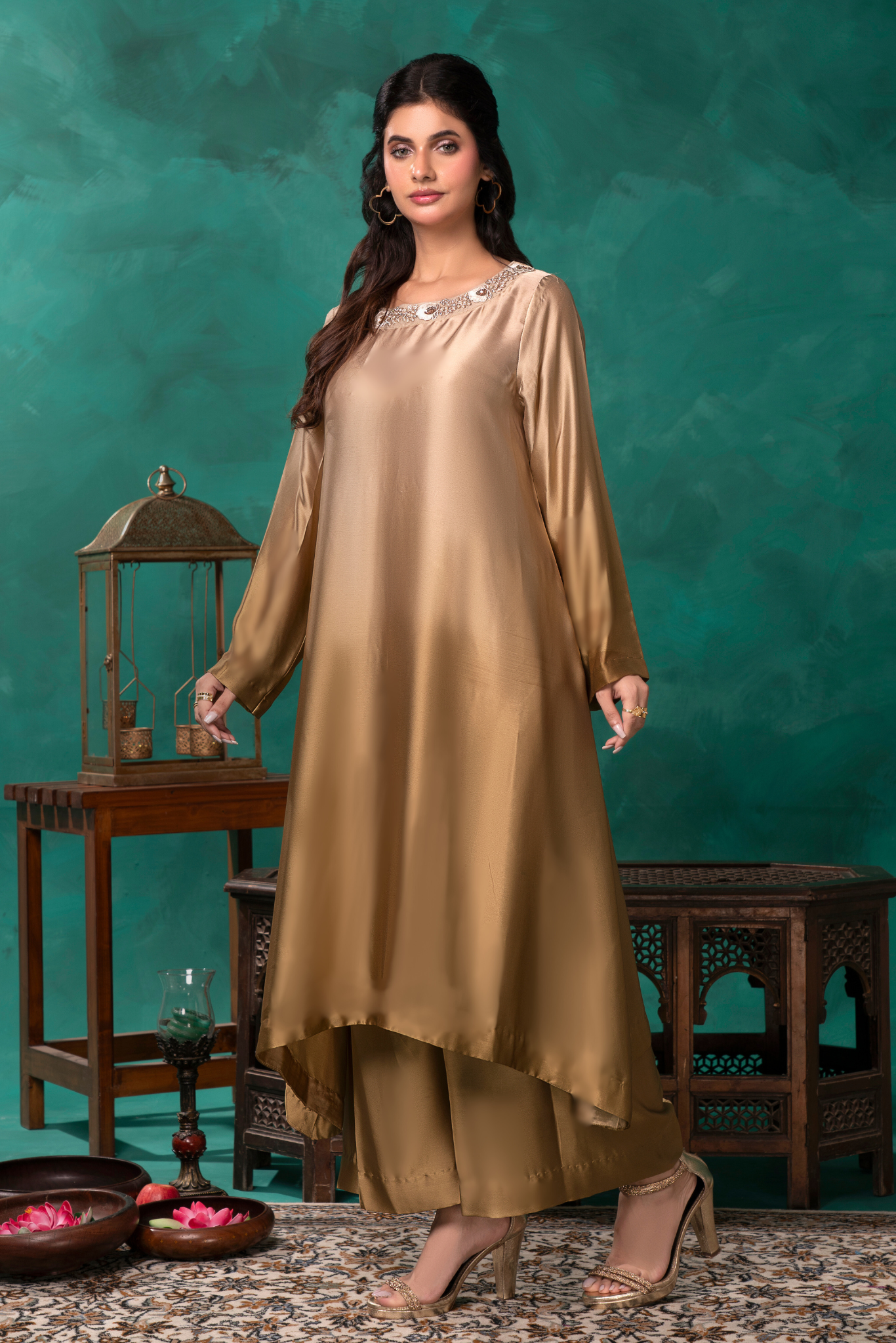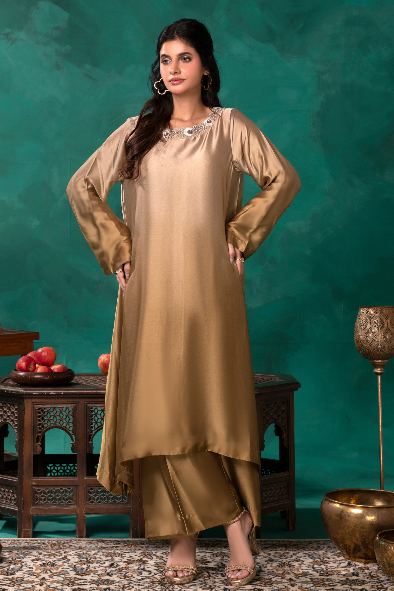 Indulge in luxury with our Sunlit Gold Coord Set. Crafted from a luscious gold ombre silk, this 2 piece set features an intricately embroidered and embellished neckline, elevating your elegance. The perfect silhouette for any occasion.