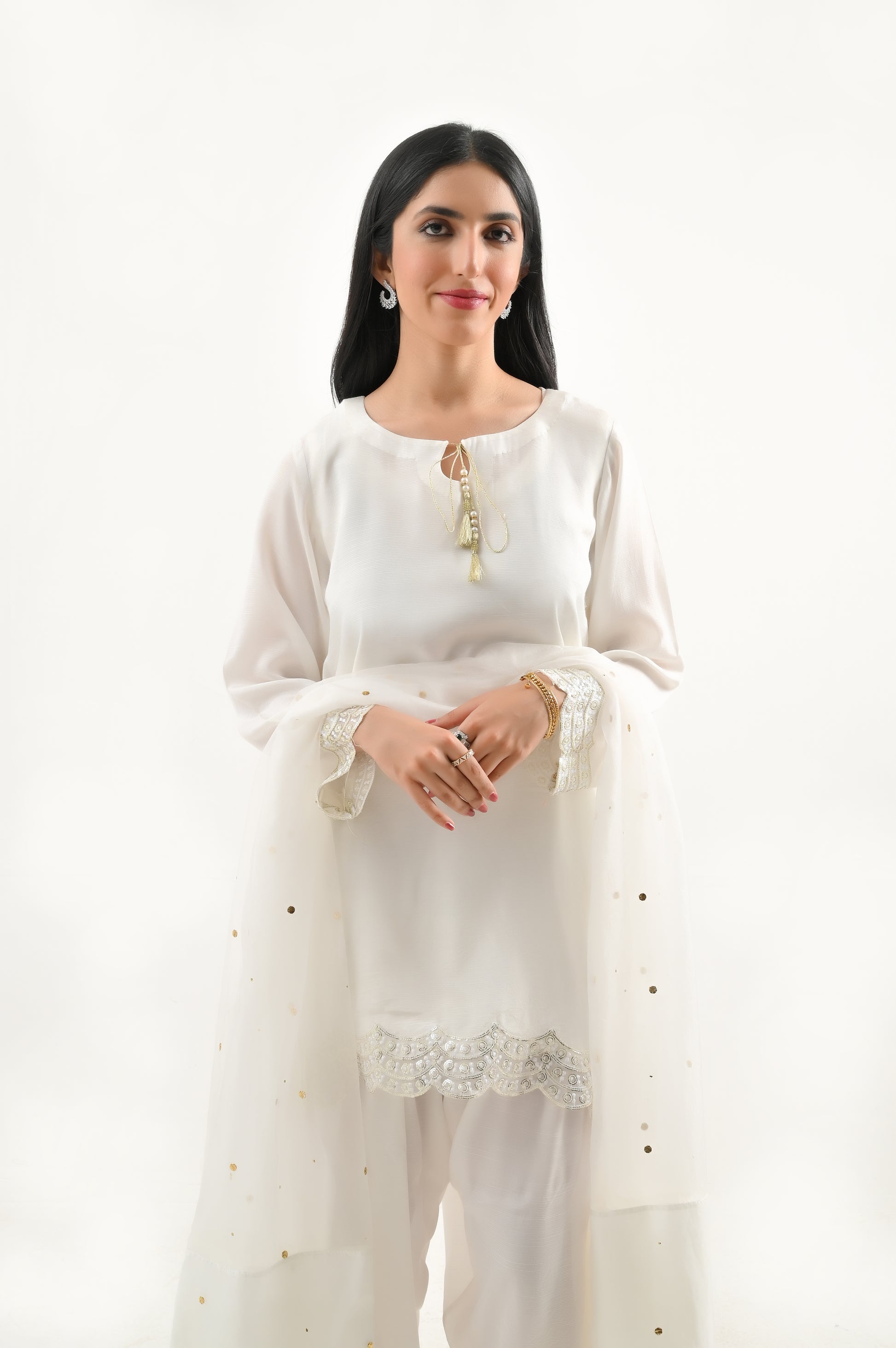 A vision of grace and sophistication, the White Elegance Farshi Set is designed for those who love effortless charm. Crafted from premium silk, this ensemble drapes beautifully and offers both comfort and luxury.