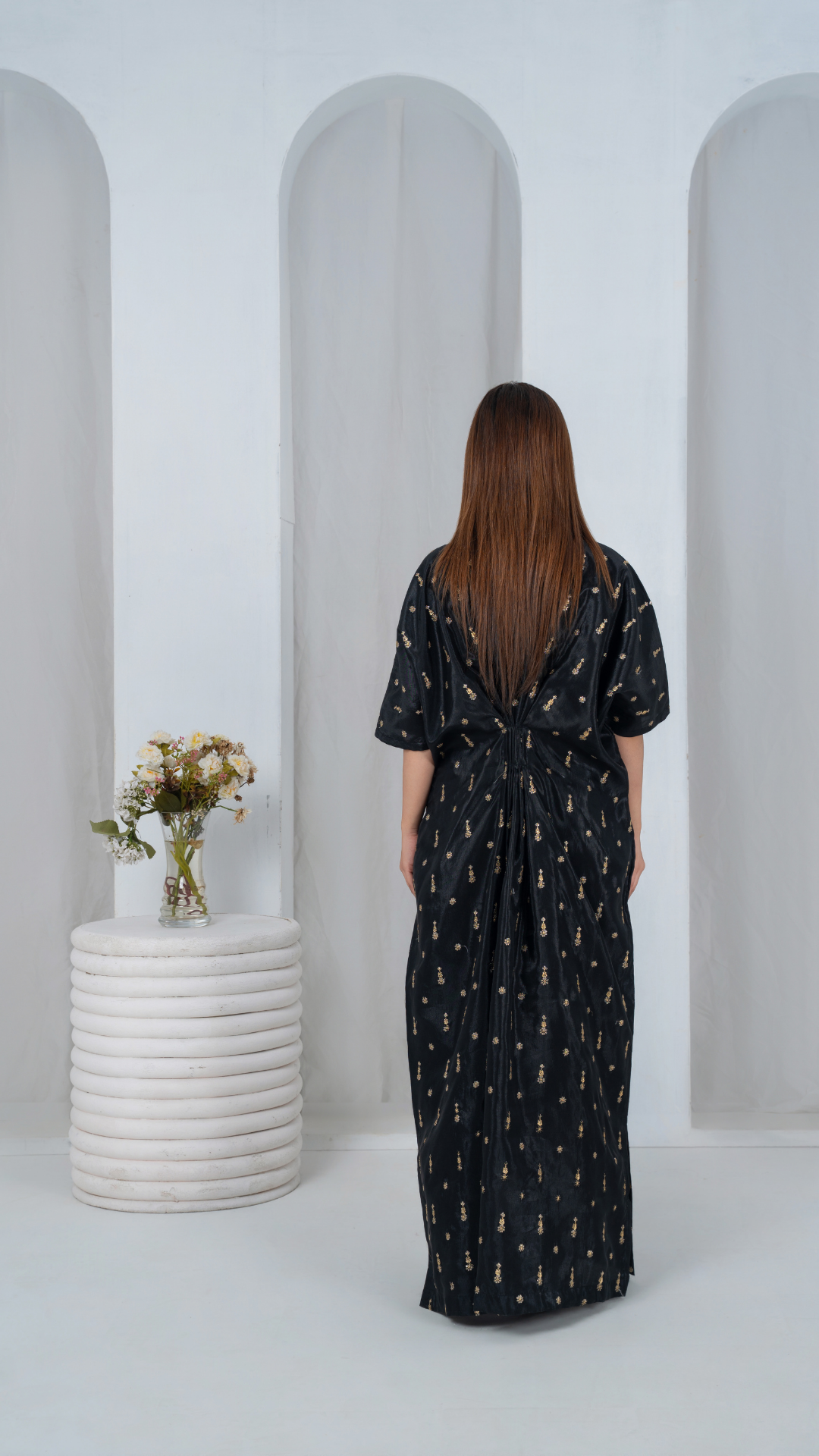 This exquisite Women's Festive/Party Wear Long Kaftan in black Kattan Silk features intricate embroidered detailing and a piece of jewelry at the center for a regal touch. The fabric enhances its flare, making it perfect for any season. With limited stock due to the scarcity of materials, this kaftan is a must-have for adding a touch of elegance to any occasion. From Ray Online Store.
